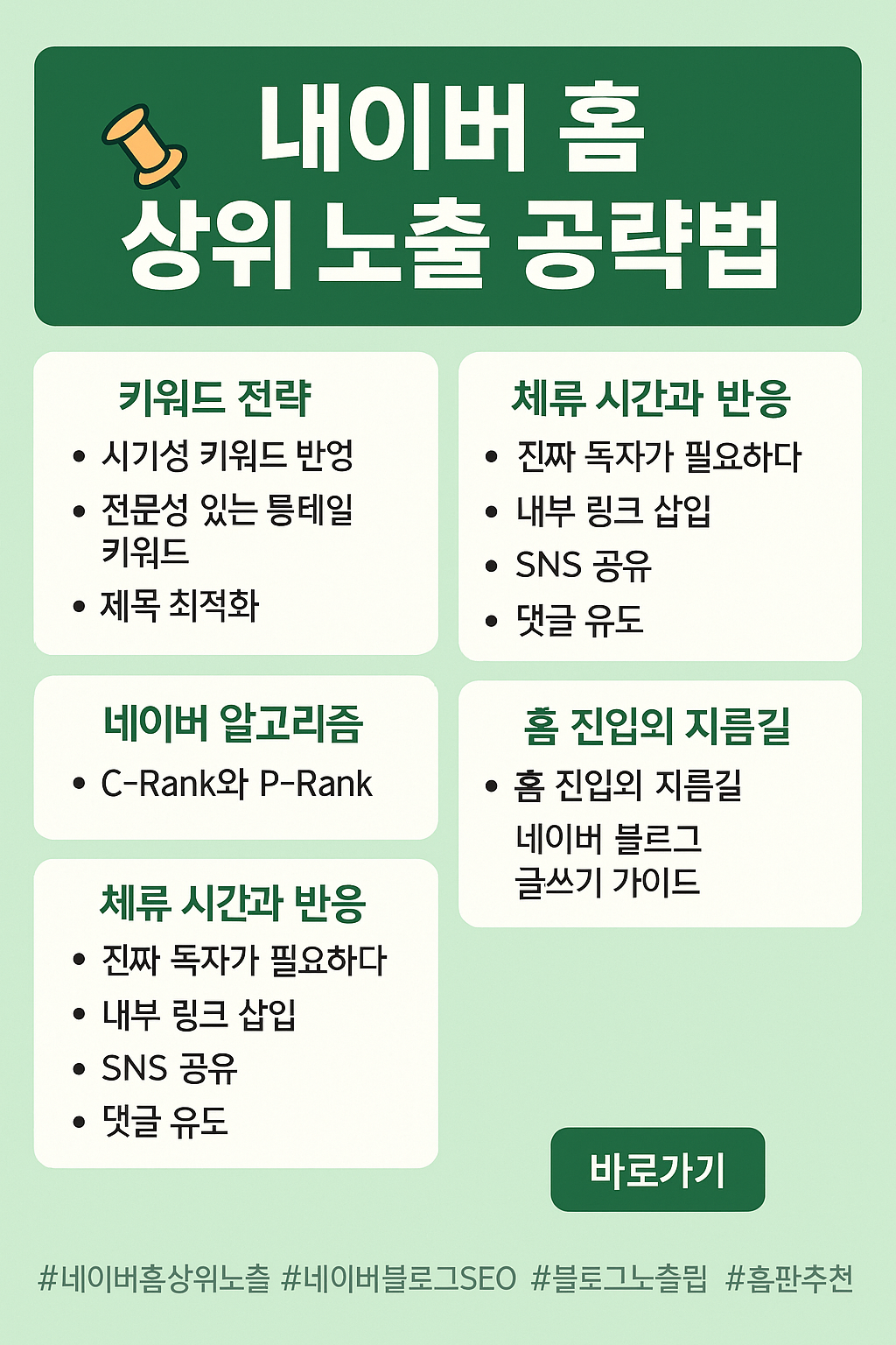네이버 홈에 뜨는 글은 단순히 운이 좋은 글이 아닙니다. 네이버의 추천 알고리즘(C-Rank, P-Rank)과 뷰(View) 탭 노출, 그리고 주제판 선정을 통해 걸러진 결과물입니다. 따라서 SEO 최적화 + 사용자 체류시간 확보 + 이웃 반응이 세 가지 핵심 포인트라 할 수 있습니다.