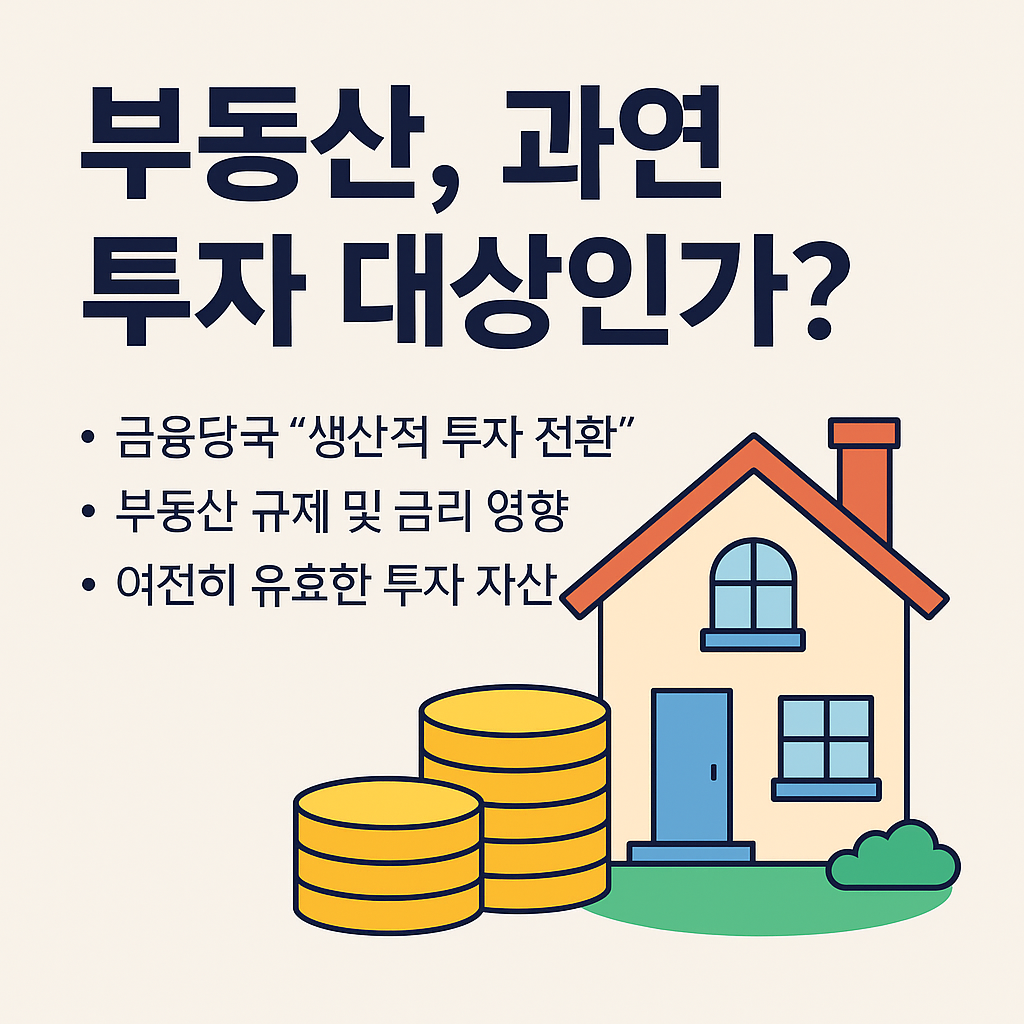 부동산은 오랫동안 한국 사회에서 가장 확실한 투자처로 여겨져 왔습니다. “땅은 절대 배신하지 않는다”라는 말처럼, 부동산은 안정성과 자산 증식을 동시에 기대할 수 있는 투자 수단으로 자리 잡아왔지요. 그러나 최근 금융당국의 정책 기조와 경제 흐름을 보면, 부동산을 둘러싼 환경이 과거와 크게 달라졌음을 확인할 수 있습니다. 그렇다면 지금 시점에서 부동산은 여전히 투자 대상이 될 수 있을까요?